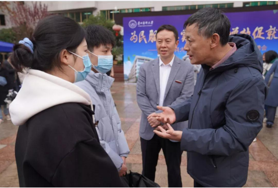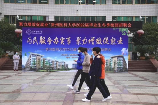 11月26日,贵州医科大学在北校区广场举办“为民服务办实事 聚力增效促就业”2022届毕业生冬季校园招聘会。贵州省普通高等学校毕业生就业工作办公室主任张华、副主任周明出席招聘会并亲临现场指导。贵州医科大学党委书记梁贵友,党委副书记、校长罗鹏,党委副书记汤磊,副校长曾柱,党委委员、党委宣传部(精神文明办)部长(主任)、党委统战部部长陈颖及学校相关职能部门负责人到招聘会现场指导工作。