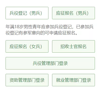 如果你是第一次进入全国征兵网,可以直接从“兵役登记(男兵)”进入页面;或者从“应征报名(男兵)”进入页面;