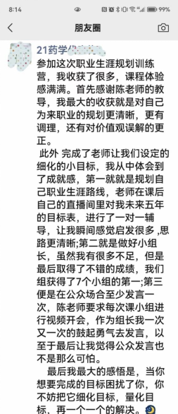本期训练营自2月中旬启动以来,通过前期的广泛宣传,共有100多位同学踊跃报名参加,最终选拔45名同学入营。训练营包含生涯与我、发现兴趣、了解性格、突出技能、澄清价值、设计人生等6大主题。在陈剑老师的全程带领和指导下,同学们通过6场直播学习、6个生涯工具实战训练、6次小组讨论互助成长、2项成长挑战和3次学习答疑等环节,体验了生命线、职业目标smart、美好时光日志、天赋SIGN、脑图等22项活动,活动设计贴近实际,突出互动交流,使学生参与感更强、学习体验更好、学习效果更直接。