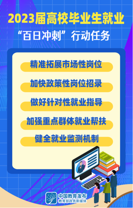 近日,教育部印发通知,决定开展2023届高校毕业生就业“百日冲刺”行动,明确精准拓展市场性岗位、做好针对性就业指导、加强重点群体就业帮扶等行动任务。