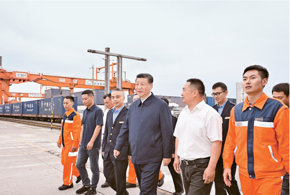 2024年4月22日至24日,中共中央总书记、国家主席、中央军委主席习近平在重庆考察。这是22日下午,习近平在重庆国际物流枢纽园区重庆铁路集装箱中心站,同货车司机、列车司机、装卸工人、场站管理人员等亲切交流。 新华社记者 岳月伟/摄