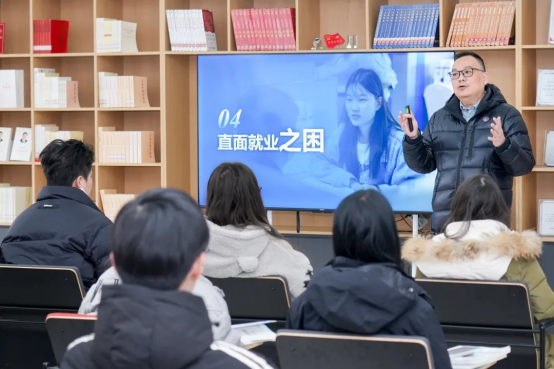 而潘毅则以《“职”面未来 “就”在当下》为题,为学生代表带来了另一堂“开学第一课”。在求职之路充满挑战与未知中,同学们如同在迷雾中寻灯塔。潘毅在课上深入解读了当前国家宏观经济形势、总体就业情况、学生就业压力以及学校对学生就业的帮扶政策,为即将走向实习和就业岗位的学子们提供全面的就业服务和宝贵的就业经验指导。