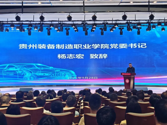 贵州装备制造职业学院党委书记杨志宏在致辞中以学院产教融合工作为切入点,深刻阐述了粤黔东西部协作的战略意义与深化成果,同时向同学们描绘了投身高端装备制造与新能源产业的广阔前景。